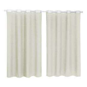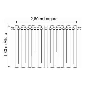Consumo de tecido: 3,00 metros x 1,80 metros Medidas prontas: largura 2,80 metros x altura 1,80 metros Quantidade de folhas: 2 folhas de 1,50 metros de largura x 1,80 metros altura Recomendável para varão simples de 2,00 metros a 2,50 metros com até 30 mm. Cor do ilhós: branco Cortina com ilhós para varão simples Não acompanha varão.