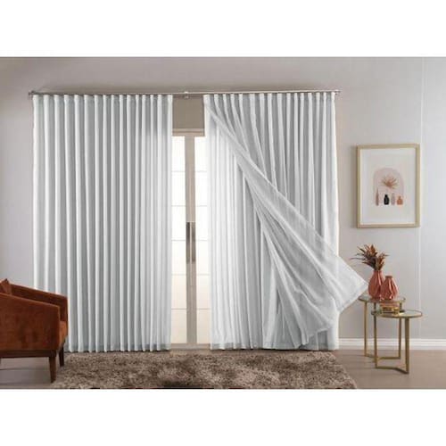 A cortina possui medidas de 6.00 metros de largura por 2.70 metros de altura, proporcionando uma cobertura ampla para janelas e portas. Seu voil branco traz um toque de delicadeza e leveza para a decoração, combinando com diversos estilos de ambientes.