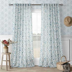 Cortinas, dois painéis, extra longas, azuis, florais, 304 cm, mistura de linho