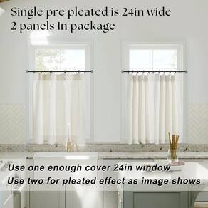 - Informações sobre o produto e facilidade de manutenção: pacote com 2 peças. Cada uma tem 24 polegadas de largura (largura com pregas, diferente de outras cortinas pequenas do mercado). Os conjuntos de cortinas podem cobrir uma janela de 48 de largura. Para um efeito mais personalizado de pregas com babados, 4 painéis são recomendados. Lavável à máquina. Sem alvejante. Seque na secadora em temperatura baixa. Passe a ferro com configurações baixas se estiverem enrugados na embalagem ou após a lavagem.