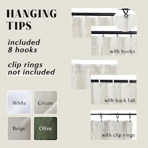 - Opções fáceis de pendurar em 3 vias: Método 1 - Com ganchos na embalagem, basta prender os ganchos na parte traseira da cortina, conforme mostra a imagem, e fixar a outra extremidade nos anéis da cortina. Método 2 - Se você preferir esconder a haste de tensão, pendure a aba traseira. Método 3 - Com seus próprios clipes de anel para um estilo mais casual.