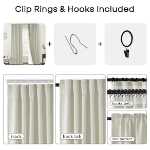- Suspensão em 3 vias: 1) Aparência plissada contemporânea (não prega de aperto) - Com anéis pretos e ganchos na fita traseira do cabeçalho da cortina no sistema de trilhos ou haste de cortina combinando. 2) Visual moderno com aba traseira – com laço oculto pendurado no varão de cortina escondendo ferragens. 3) Visual simples de clipes casuais: Basta usar clipes no cabeçalho da cortina.
