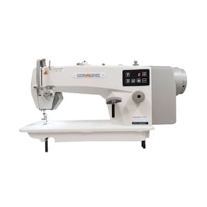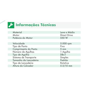 Motor: Eletrônico Direct Drive Potência: 550W Tensão: 110 OU 220v Velocidade: 5.000 ppm Comprimento do ponto: 5mm Número de agulhas: 1 Tipo de agulha: DBx1 Lançadeira: padrão Altura do calcador: 6/13 mm Lubrificação automática Enchedor de bobina acoplado ao cabeçote