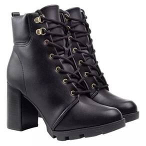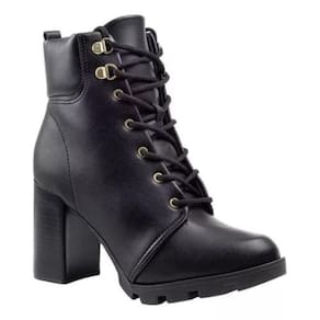 Coturno Beira Rio Salto Alto Solado Tratorado Feminino Preto. Confeccionado em material sintético (napa) por completo, de ótima qualidade e durabilidade, detalhe no cano em tecido strech canelado e solado tratorado. O modelo possui forração em tecido, para assim manter seus pés quentinhos no inverno, palmilha em PU com espuma dupla para melhor conforto. Possui fechamento em cadarço, para melhor calce e ajuste aos pés. Cano médio com detalhe em tecido, de fácil combinação com looks. Solado em PVC tratorado antiderrapante, dando um charme a mais para a peça. Bico redondo. Salto quadrado em 9,0 cm de altura, somente para conforto. Garanta já!