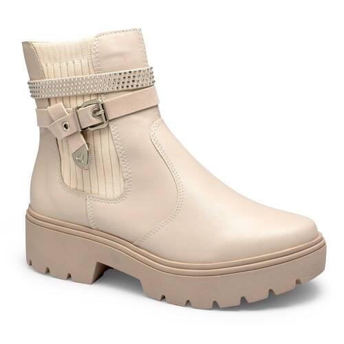 A bota possui cano curto com altura de 13 cm e circunferência de 24 cm, sola tratorada e salto bloco com 5 cm de altura, garantindo estabilidade e segurança durante o uso. O modelo é estilo chelsea, destacando a tira com brilhos e a tira com fivela metalizada no cano, que garantem um toque atemporal.