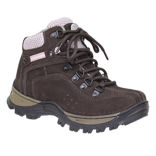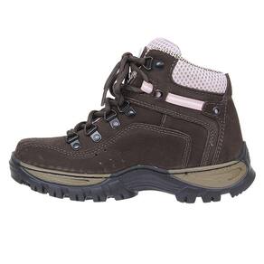 Coturno adventure feminino PLLO fabricado em couro na cor Marrom, possui cano curto com detalhes na cor Rosa, bico redondo, costuras reforçadas, fechamento por cadarço e solado de borracha.