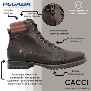 Os calçados Pegada são produzidos em couro, matéria-prima de alta qualidade, que oferece conforto, maciez, resistência e muita durabilidade, que pode ser ainda mais prolongada se você manter os cuidados com o couro, como deixar o calçado em um ambiente arejado quando não estiver em uso, limpar com um paninho úmido ou escova de cerdas macias, de forma suave e secar sempre à sombra. Além disso, existem alguns cremes específicos para manter ou renovar a aparência do couro.