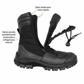 O Fechamento duplo lateral auxiliando o calçar e fechamento da bota mais rapidamente. fechamento com tira protegendo o Fechamento do lado interno.