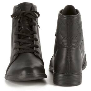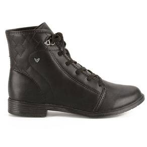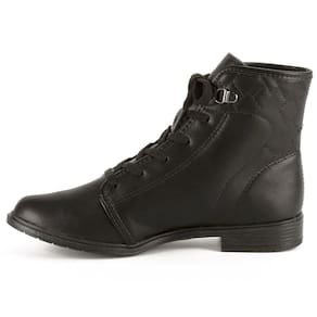 A bota possui salto baixo com 2,5 cm, que garante conforto durante todo o dia, e cadarço de amarrar para um ajuste perfeito. O material sintético de alta qualidade é leve e durável, e os detalhes em metal e as costuras no cano trazem um toque moderno e atemporal. Além disso, o modelo possui altura do cano de 13,5 cm e circunferência de 22 cm.