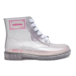 Confeccionada em PVC translúcido com glitter, esse calçado tem o design clássico de coturno com um toque bem diferentão, que vai acrescentar ainda mais estilo a qualquer lookinho, desde os mais casuais até os mais produzidos.