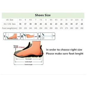 Nota: Por favor, escolha o tamanho de acordo com o comprimento do seu pé (cm). Se seus pés são gordos ou largos, você pode adicionar meio tamanho ou mais para se certificar de que os sapatos se encaixam em você: Tamanho Correspondência: