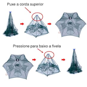 Fácil Manuseio e Montagem: A montagem da Armadilha Covo Lorben é tão simples quanto abrir um guarda-chuva. A argola de plástico e a corda facilitam a fixação, o manuseio e a recuperação da armadilha, tornando sua experiência de pesca mais eficiente.
