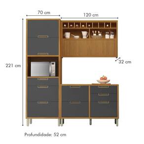 Medida de cada item (A x L x P): 1 Paneleiro: 221cm x 70cm x 52cm 1 Aereo 120cm: 78cm x 120cm x 52cm 1 Balcão 120cm: 86cm x 120cm x 52cm