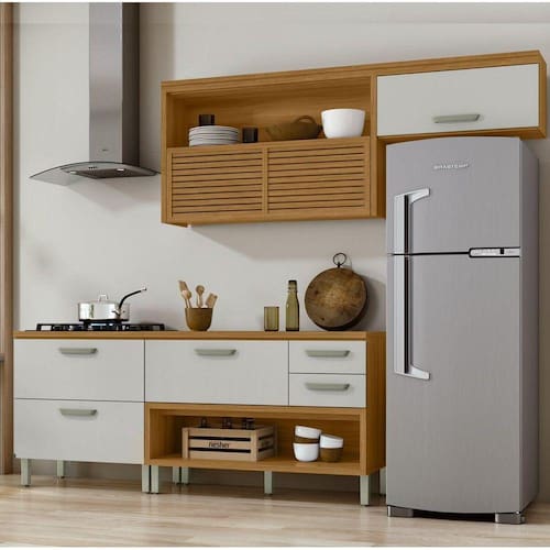 O armário aéreo de 2,00, foi projeto com uma porta articulada ripada, que traz aconchego, grande beleza e harmonia ao conjunto. Este mesmo armário possui montagem Flex, podendo o armário de geladeira/depurador ser posicionado a direita ou a esquerda na primeira montagem.