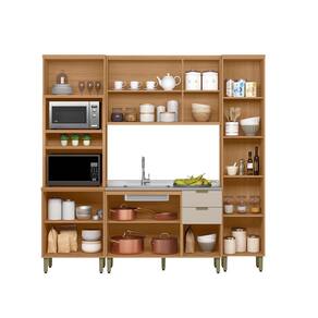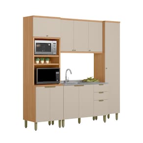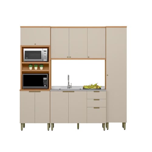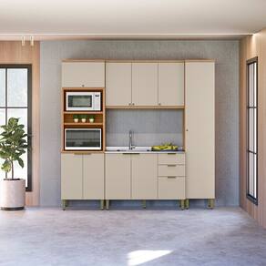 A Cozinha Selene, com 4 modulos, e a escolha ideal para quem valoriza funcionalidade aliada a um design contemporaneo. Produzida 100 em MDF, proporciona resistencia e um acabamento de alto padrao. Apresenta dobradicas com amortecimento e sofisticados puxadores dourados de sobrepor, que agregam elegancia ao conjunto. Conta com uma torre com nichos e um paneleiro, oferecendo mais espaco e praticidade no dia a dia. O balcao de 1,20m, sem tampo, e perfeito para instalacao de pia. Um modelo versatil e refinado para deixar sua cozinha ainda mais organizada e estilosa.