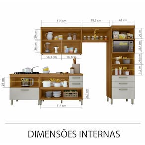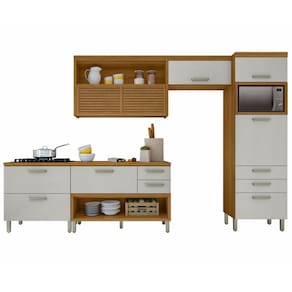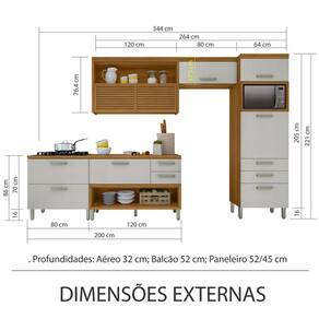 Diferenciais únicos: Modernas portas com abertura basculante e pistão a gás. Modernos puxadores de ABS beleza, qualidade e durabilidade. Corrediça Telescópica Abertura Integral: Robusta e com três estágios, esta corrediça é ideal para o uso diário, facilitando o acesso aos utensílios. Ergonômicos gavetões com laterais e traseiros altos para armazenagem com segurança de utensílios e mantimentos. Paneleiro com nicho para micro-ondas.