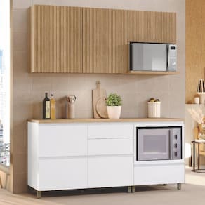 Os armários aéreos foram projetados com porta canelada, tendencia de Milão - Itália, que propõe sofisticação, aconchego, grande beleza e harmonia ao conjunto. Acabamento da Prateleira: Impressão Escala de Brilho da Prateleira: Semi-Brilho Acabamento da Gaveta: Impressão Escala de Brilho da Gaveta: Semi-Brilho Material do Puxador da Gaveta: Alumínio Acabamento da Porta: Impressão Escala de Brilho da Porta: Semi-Brilho Acabamento dos Pés: Pintura Acompanha Tampo: Sim Altura dos Pés: 10 cm Ambiente Principal: Cozinha codigo_ean: 7909903407523 Complexidade da Montagem: Alta: deve ser montado por um montador especializado Cor: Branco/Marrom Cor do Produto: Branco/Marrom Escala de Brilho: Semi-Brilho Gaveta com Chave: Não Itens Inclusos: Cozinha 4 peças, Kit de Ferragens e Manual de Montagem Linha ou Coleção: Rainha Manual de Montagem e Instalação: https://product-hub-prd.madeiramadeira.com.br/867673/documents/e1545ef1-4737-4aef-a838-89d0b4727935asrainha500816500817500818.pdf Material da Dobradiça/Corrediça da Porta: Aço Material da Gaveta: MDF Material da Porta: MDF Material da Prateleira: MDF Material do Tampo: MDF Material dos Pés: Plástico Medida de cada item (A x L x P): Armário Aéreo 2 Portas: 80cmx120cmx32cm Armario Aéreo Microondas: 80cmx70cmx42cm, Balcão 1 Porta Báscula 4 Gavetas: 91cmx120cmx52cm, Balcão Forno: 91cmx70cmx52cm modular: Sim Necessita Montagem: Sim O Balcão Acompanha Pia: Não Origem do Produto: Nacional Pés Reguláveis: Sim Peso: 134,14 kg Peso Máximo por Gaveta: 5 kg Peso Máximo por Prateleira: 10 kg Possui Pés: 09 Possui Portas: Sim Possui Prateleiras: Sim Possui recorte para Cooktop: Não Possui Rodízio: Não Possui Vidro: Não Produto Montado: Sim Recomendações de Uso, Manutenção e Limpeza: Utilizar pano macio levemente umedecido e na sequencia pano macio seco. Sapatas Niveladoras: Sim Sistema de Montagem: Parafusos e Cavilhas Tipo de Corrediça da Gaveta: Metálica Telescópica Tipo de Dobradiça da Porta: 35 mm Tipo de Puxador da Gaveta: Externo Tipo de Puxador da Porta: Embutido Ean: 7909903407523