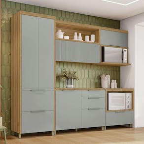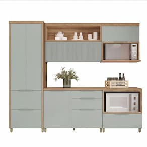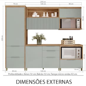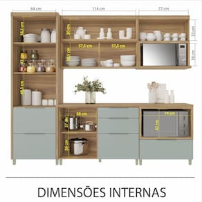 Diferenciais únicos: Modernas portas com abertura basculante e pistão a gás, sendo uma de 120cm canelada, tendência, sofisticação e beleza. Dobradiças com freio anti-impacto slow motion, porta de 60 cm com 3 dobradiças, conforto e garantia de durabilidade. Modernos puxadores de alumínio, tendência, sofisticação, durabilidade e beleza. Corrediça Telescópica Abertura Integral: Robusta e com três estágios, esta corrediça é ideal para o uso diário, facilitando o acesso aos utensílios. Ergonômico gavetão com laterais e traseiro altos para armazenagem com segurança de utensílios e mantimentos. Gaveta porta condimentos e Gaveta com organizador de talheres, conforto e praticidade no uso diário.