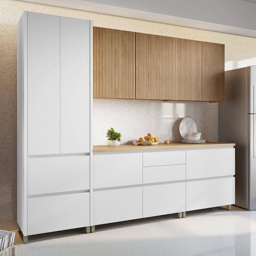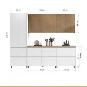 Os armários aéreos foram projetados com porta canelada, tendencia de Milão - Itália, que propõe sofisticação, aconchego, grande beleza e harmonia ao conjunto. Acabamento da Prateleira: Pintura Escala de Brilho da Prateleira: Fosco Acabamento da Gaveta: Pintura Escala de Brilho da Gaveta: Fosco Acabamento da Porta: Pintura Escala de Brilho da Porta: Fosco Acabamento dos Pés: Pintura Acompanha Tampo: Sim Altura dos Pés: 10 cm Ambiente Principal: Cozinha codigo_ean: 7909903399613 Complexidade da Montagem: Alta: deve ser montado por um montador especializado Cor: Branco/Marrom Cor do Produto: Branco/Marrom Escala de Brilho: Fosco Gaveta com Chave: Não Itens Inclusos: 1 Cozinha completa, 1 Manual de Montagem e 1 Kit Ferragens. Manual de Montagem e Instalação: https://product-hub-prd.madeiramadeira.com.br/865731/documents/58b3d455-0a84-41fd-9e05-e9baff465559Csrainha500798500811500803.pdf Material da Dobradiça/Corrediça da Porta: Aço Material da Gaveta: MDF Material da Porta: MDF Material da Prateleira: MDF Material do Tampo: MDF Material dos Pés: Polipropileno Medida de cada item (A x L x P): 1 Paneleiro: 228cm x 70cm x 52cm 1 Aereo 120cm: 80cm x 120cm x 32cm 1 Aereo 80cm: 80cm x 80cm x 32cm 1 Balcão 120cm: 91cm x 120cm x 52cm 1 Balcão 80cm: 91cm x 80cm x 52cm modular: Sim Necessita Montagem: Sim O Balcão Acompanha Pia: Não Origem do Produto: Nacional Pés Reguláveis: Sim Peso: 236,8 kg Peso Máximo por Gaveta: 5 kg Peso Máximo por Prateleira: 15 kg Possui Pés: 13 Possui Portas: Sim Possui Prateleiras: Sim Possui recorte para Cooktop: Não Possui Rodízio: Não Possui Vidro: Não Produto Montado: Sim Recomendações de Uso, Manutenção e Limpeza: Utilizar pano macio levemente umedecido e na sequencia pano macio seco. Sapatas Niveladoras: Sim Sistema de Montagem: Parafusos e Cavilhas Tipo de Corrediça da Gaveta: Metálica Telescópica Tipo de Dobradiça da Porta: 35 mm Tipo de Puxador da Gaveta: Embutido Tipo de Puxador da Porta: Embutido Ean: 7909903399613