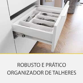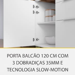 Diferenciais unicos: Modernas portas com abertura basculante e pistao a gas,. Dobradicas com freio anti-impacto slow motion, conforto e garantia de durabilidade. Modernos puxadores de aluminio, tendencia, sofisticacao, durabilidade e beleza. Corredica Telescopica Abertura Integral: Robusta e com tres estagios, esta corredica e ideal para o uso diario, facilitando o acesso aos utensilios. Ergonomico gavetao com laterais e traseiro altos para armazenagem com seguranca de utensilios e mantimentos. Gaveta porta condimentos e Gaveta com organizador de talheres, conforto e praticidade no uso diario.
