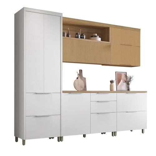 Cozinha 5 Peças Marquesa 7 Portas 6 Gavetas 100% Mdf Nesher Branca / Nature A linha de cozinha Nesher Marquesa 100 MDF e com certificacao FSC(R), tem design contemporaneo, robusto e e muito pratica. Inspirada em cozinhas planejadas, esta disponivel em modulos, permitindo composicoes variadas, projetos exclusivos, conforme o espaco e o gosto do consumidor.