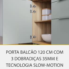 Diferenciais unicos: Modernas portas com abertura basculante e pistao a gas,. Dobradicas com freio anti-impacto slow motion, conforto e garantia de durabilidade. Modernos puxadores de aluminio, tendencia, sofisticacao, durabilidade e beleza. Corredica Telescopica Abertura Integral: Robusta e com tres estagios, esta corredica e ideal para o uso diario, facilitando o acesso aos utensilios. Ergonomico gavetao com laterais e traseiro altos para armazenagem com seguranca de utensilios e mantimentos. Gaveta porta condimentos e Gaveta com organizador de talheres, conforto e praticidade no uso diario.