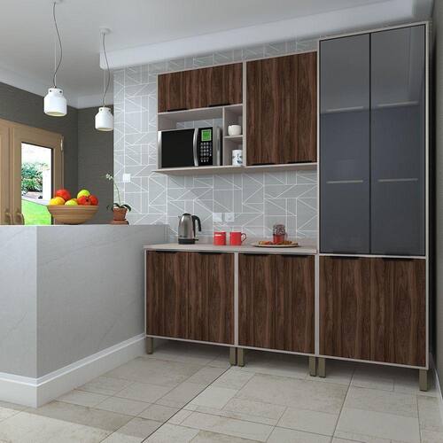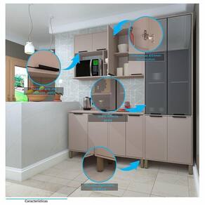 Desenvolvida com materiais de excelencia, a Cozinha Stylo oferece excelente distribuicao de espaco interno. E estruturada em 100 MDP e possui dobradicas slow motion com amortecedor incorporado para fechamento suave das portas. Conta com puxadores tipo aste em Aluminio Preto dando um toque especial de classe e elegancia.