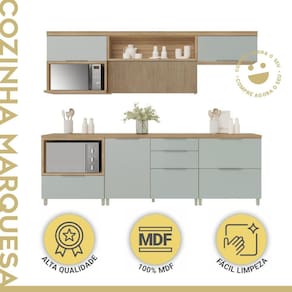 Inspirada em cozinhas planejadas, está disponível em módulos, permitindo composições variadas, projetos exclusivos, conforme o espaço e o gosto do consumidor. Acabamento da Prateleira: Impressão Escala de Brilho da Prateleira: Fosco Acabamento da Gaveta: Impressão Escala de Brilho da Gaveta: Fosco Material do Puxador da Gaveta: Alumínio Acabamento da Porta: Impressão Escala de Brilho da Porta: Fosco Material do Puxador da Porta: Alumínio Acabamento dos Pés: Pintura Acompanha Tampo: Sim Altura dos Pés: 10 cm Altura Máxima dos Pés: 10.0000 Ambiente Principal: Cozinha codigo_ean: 7909903438541 Complexidade da Montagem: Alta: deve ser montado por um montador especializado Cor: Marrom/Verde Cor do Produto: Marrom/Verde Escala de Brilho: Fosco Gaveta com Chave: Não Itens Inclusos: 1 Cozinha, Manual de montagem e Kit Ferragens. Manual de Montagem e Instalação: https://product-hub-prd.madeiramadeira.com.br/871385/documents/8a1ad34e-7b4c-4980-bccc-184df7ddcb5binha6pCs500820500824500827.pdf Material da Dobradiça/Corrediça da Porta: Aço Material da Gaveta: MDF Material da Porta: MDF Material da Prateleira: MDF Material do Tampo: MDF Material dos Pés: Polipropileno Medida de cada item (A x L x P): 1 Aereo 80cm: 82cm x 80cm x 42cm 1 aereo 120cm: 82cm x 120cm x 32cm 1 Aereo Geladeira: 39,5cm x 80cm x 32cm 1 Balcão Forno: 91cm x 80cm x 52cm 1 Balcão 120cm: 91cm x 120cm x 52cm1 Balcão 80cm: 91cm x 80cm x 52cm modular: Sim Necessita Montagem: Sim O Balcão Acompanha Pia: Não Origem do Produto: Nacional Pés Reguláveis: Sim Peso: 200,8 kg Peso Máximo por Gaveta: 5 kg Peso Máximo por Prateleira: 10 kg Possui Pés: 13 Possui Portas: Sim Possui Prateleiras: Sim Possui recorte para Cooktop: Não Possui Rodízio: Não Possui Vidro: Não Produto Montado: Sim Recomendações de Uso, Manutenção e Limpeza: Utilizar pano macio levemente umedecido e na sequencia pano macio seco. Sapatas Niveladoras: Sim Sistema de Montagem: Parafusos, Minifix e Cavilhas. Tipo de Corrediça da Gaveta: Metálica Telescópica Tipo de Dobradiça da Porta: 35 mm Tipo de Puxador da Gaveta: Externo Tipo de Puxador da Porta: Externo Ean: 7909903438541