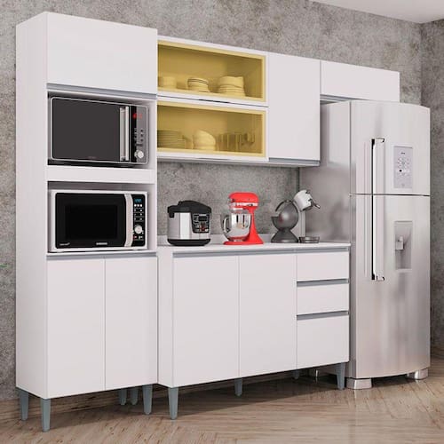 Chegou para inovar sua cozinha e proporcionar um toque especial, a Cozinha Aline composta por: Paneleiro para micro-ondas e forno, Aéreo basculante, Aéreo de Geladeira e Balcão com tampo desenvolvida pela Poquema com materiais de ótimas qualidades, maior durabilidade do móvel, conta com amplo espaço interno para melhor organizar seus utensílios, lindo design na cor Branco proporcionando modernidade ao ambiente. Não deixe de aproveitar, garanta o seu!