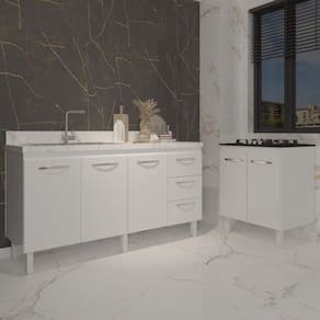 Conheça o Kit Balcão de Pia 150 cm + Balcão para Cooktop 4 Bocas, a solução ideal para quem deseja unir praticidade e elegância na cozinha. Com um design contemporâneo, o balcão de pia oferece 3 portas e 3 gavetas, garantindo amplo espaço para organizar seus utensílios. O balcão para cooktop possui duas portas, proporcionando uma cozinha mais funcional e eficiente. Produzido em MDP, com puxadores cromados e pés reguláveis, esse conjunto traz durabilidade e estilo, além de fácil nivelamento para qualquer ambiente.