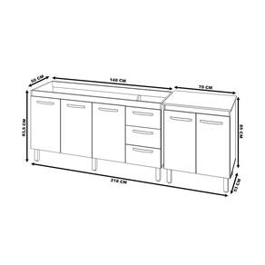 Características do Kit Montado: Largura total: 218 cm Profundidade: 53 cm Altura: 85 cm (com tampo do balcão de microondas)
