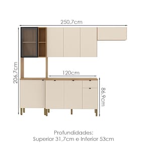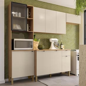 Cozinha e Balcão com tampo, design moderno que se adapta ao seu espaço! Produzida em MDF (12mm) com acabamento em pintura UV. Conta com 09 portas (01 basculante e 01 de vidro), sendo as superiores com sistema passante (sem puxadores), 01 gaveta, dobradiças metálicas, corrediças telescópicas, nicho para microondas/forno e prateleiras internas. Os pés reguláveis são em plástico resistente, e o puxadores (portas inferiores) em alumínio. Este produto será entregue em 05 volumes.