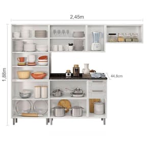 Estrutura : : : : : : : : : Em Aço carbono com acabamento em pintura eletrostáticaAcabamento: : : : : : : : : Pintura epóxiPortas: : : : : : : : : 14 portas sendo 03 portas com vidro temperados e com dobradiças metálicasGavetas: : : : : : : : : 03 gavetas com estrutura super-resistente e 100% em aço, com corrediças metálicasPuxadores: : : : : : : : : PVCPés: : : : : : : : : PVC na coloração grafite e com ajuste de alturaTampo Balcão: : : : : : : : : MDP 25 mmLargura Paneleiro Duplo: : : : : : : : : 70,0 cmAltura Paneleiro Duplo: : : : : : : : : 188,0 cmProfundidade Paneleiro Duplo: : : : : : : : : 28,3 cmLargura Armário Triplo com Vidro: : : : : : : : : 105,0 cmAltura Armário Triplo com Vídro: : : : : : : : : 52,5 cmProfundidade Altura Armário Triplo com Vídro: : : : : : : : : 28,3 cmLargura Armário Duplo Geladeira: : : : : : : : : 70,0 cmAltura Armário Duplo Geladeira: : : : : : : : : 35,0 cmProfundidade Altura Armário Duplo Geladeira: : : : : : : : : 28,3 cmLargura Balcão com 03 gavetas: : : : : : : : : 105,0 cmAltura Balcão com 03 gavetas: : : : : : : : : 85,3 cmProfundidade Balcão com 04 gavetas: : : : : : : : : 44,8 cmLargura Total: : : : : : : : : 245,0 cmAltura Total: : : : : : : : : 188,0 cmProfundidade balcão: : : : : : : : : 44,8 cmPeso Total: : : : : : : : : 69,05 KgGarantia: : : : : : : : : 03 mesesInformações Sobre Montagem: : : : : : : : : Não possuímos serviço de montagem.