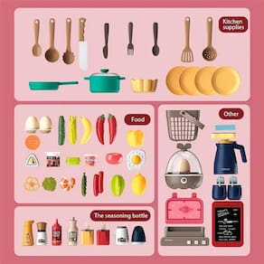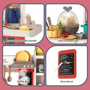 As crianças vão adorar brincar de culinária com a Cozinha de brinquedo super moderna e educativa Gire o botão do fogão e a panela sairá vapor, acenderá luz e emitirá som que simula um fogão real Simule a cena da culinária e desenvolva o interesse em cozinhar nas crianças. A torneira solta água de verdade A criança pode experimentar lavar a louça de uma forma divertida. Várias formas de abrir a porta, como abertura deslizante e plana. Use o quadro negro para as crianças escrever o menu do dia. Usando a cesta, prateleira e armário ajuda no desenvolvimento da noção espacial. Estimule nas crianças a percepção visual e coordenação viso motora ao manusear os objetos da cozinha. A interação com estes brinquedos promove o contato com a realidade através do imaginário, deixando a tecnologia de lado e apostando na criatividade. Brincar de cozinhar com uma criança será divertido, muito interessante e educativo.