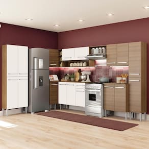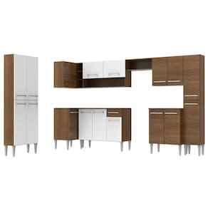 A Cozinha Completa Emilly de Canto Reto é completa e perfeita para o seu dia a dia. Possui puxadores com alumínio e corrediças e dobradiças metálicas resistentes. Conta com 17 portas, 1 gaveta e 5 nichos com o máximo de aproveitamento de espaços. Todos os balcões acompanham tampo de madeira.
