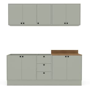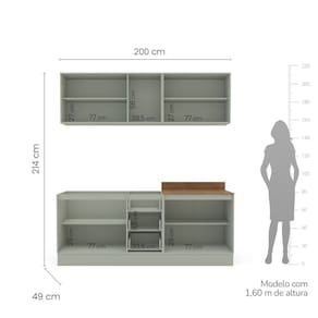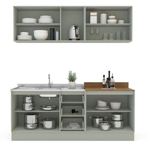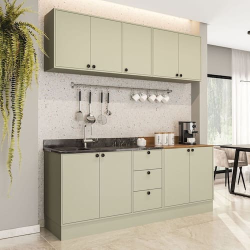 A Cozinha Rubi Yescasa é a escolha perfeita para quem busca sofisticação e praticidade no dia a dia. Com puxadores ponto que trazem um toque elegante e moderno, ela conta com acabamento em pintura UV, garantindo maior resistência, durabilidade e brilho às peças. Seu amplo espaço de 200 cm de largura, 214 cm de altura e 49 cm de profundidade oferece organização inteligente para todos os utensílios. O modelo armários aéreos para guardar seus utensílios e alimentos, balcões com espaço para pia e com tampo . Completa e funcional, essa cozinha une design, qualidade e praticidade para transformar o coração da sua casa. Acabamento da Prateleira: Pintura Escala de Brilho da Prateleira: Semi-Fosco Acabamento da Gaveta: Pintura Material do Puxador da Gaveta: Plástico Acabamento da Porta: Pintura Escala de Brilho da Porta: Semi-Fosco Material do Puxador da Porta: Plástico Acompanha Tampo: Sim Ambiente Principal: Cozinha Balcão Suporta Pia: Sim codigo_ean: 7900288239082 Complexidade da Montagem: Alta: deve ser montado por um montador especializado Cor: Verde Oliva Cor do Produto: Verde Oliva Cor Interna: Verde Oliva Escala de Brilho: Semi-Fosco Gaveta com Chave: Não Itens Inclusos: 1 Cozinha Completa, Kit de Ferragens, Manual de Montagem e Termo de Garantia Linha ou Coleção: Rubi Manual de Montagem e Instalação: https://product-hub-prd.madeiramadeira.com.br/512237607/documents/599b91f8-1596-437b-b5da-1f246550d4b03229329622417586344809052.pdf Marca: Yescasa Material da Corrediça: Metálica Material da Dobradiça/Corrediça da Porta: Metálica Material da Gaveta: MDP Material da Porta: MDP Material da Prateleira: MDP Material do Tampo: MDP Material dos Pés: MDP Medida de cada item (A x L x P): Balcão 3 gavetas (81cm x 120cm x 49cm); Aéreo 3 portas (59cm x 120cm x 29cm); balcão com tampo (92,5cm x 80cm x 49cm); Aéreo 2 portas (59cm x 80cm x 59cm) modular: Sim Necessita Montagem: Sim O Balcão Acompanha Pia: Não Origem do Produto: Nacional Pés Reguláveis: Não Peso: 80,55 kg Peso Máximo por Gaveta: 5 kg Peso Máximo por Prateleira: 5 kg Possui Pés: Rodapé Possui Portas: Sim Possui Prateleiras: Sim Possui recorte para Cooktop: Não Possui Rodízio: Não Produto Montado: Sim Recomendações de Uso, Manutenção e Limpeza: Utilize um pano macio umedecido com água e sabão neutro, seguido de pano seco. Não utilize produtos químicos ou abrasivos para limpeza, pois estes danificam o revestimento do móvel. Sapatas Niveladoras: Não Sistema de Montagem: Cavilha, Parafuso, Minifix e prego. Acompanha bucha e parafuso para fixação na parede Suporta Até (kg): 30 kg Tipo de Corrediça da Gaveta: Simples Tipo de Dobradiça da Porta: Simples Tipo de Dobradiça/Corrediça da Porta: Simples Tipo de Puxador da Gaveta: Externo Tipo de Puxador da Porta: Externo
