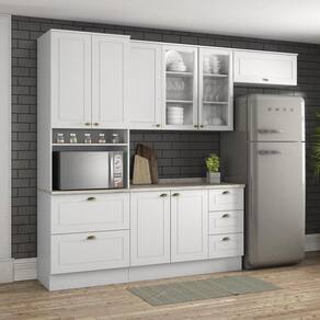 FICHA TÉCNICA: Cor Interna: Trama Branco Acabamento: Pintura UV Escala de Brilho: Fosco Material do Fundo: MDF Material Principal: MDF Qtd. Gavetas: 5 Peso Máximo por Gaveta: 3 Kg Material do Puxador Gaveta: Metal Zamac Material da Corrediça: Metálica Telescópica Material da Gaveta: MDF Qtd. Portas: 8 Material da Dobradiça: Metálica Material do Puxador Porta: Metal Zamac Tipo Porta: 07 Articuladas e 01 Basculante Qtd. Prateleiras: 8 Peso Máximo por Prateleira: 8 Kg Material da Prateleira: MDF Qtd. Pés: Não possui, apenas rodapé Altura Pés/Rodapés: 14,5 Cm Balcão Acompanha Pia: Não Tamanho Indicado da Pia: 120cm x 52cm Acompanha Tampo: Sim Material do Tampo: BP Produto Suporte até (Kg): 63 Kg Tampo possui recorte p/Cooktop: Não Medidas Conjunto Montado: 220,5 x 271,5 x 51 Cm Peso Conjunto Montado: 165 KgCor: Cor