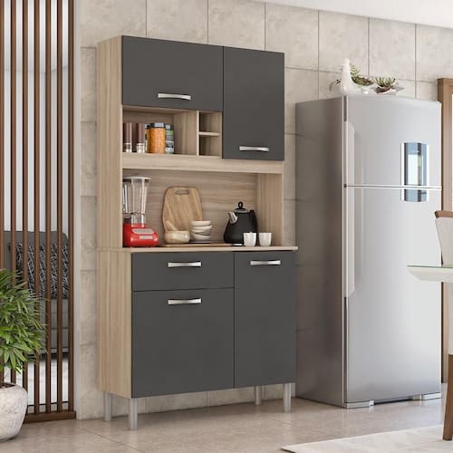 Características Estrutura em MDP. Pintura em acabamento UV. 04 Portas articuladas com dobradiças metálicas 01 Gaveta com corrediças metálicas Pés em PVC Puxadores em plástico ABS Prateleiras e compartimentos bem divididos