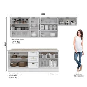 FICHA TECNICA: Cor Interna: Trama Branco Acabamento: Pintura UV Escala de Brilho: Fosco Material do Fundo: MDF Material Principal: MDF Qtd. Gavetas: 03 Peso Maximo por Gaveta: 03 Kg Material do Puxador Gaveta: Metal Zamac Material da Corredica: Metalica Telescopica Material da Gaveta: MDF Qtd. Portas: 10 Material da Dobradica: Metalica Material do Puxador Porta: Metal Zamac Tipo Porta: 09 de Dobradica e 01 Basculante Qtd. Prateleiras: 07 Peso Maximo por Prateleira: 8 Kg Material da Prateleira: MDF Qtd. Pes: Nao possui, apenas rodape Altura Pes/Rodapes: 14,5 Cm Balcao Acompanha Pia: Nao Tamanho Indicado da Pia: 120cm x 52cm Acompanha Tampo: Sim Material do Tampo: BP Produto Suporte ate -Kg-: 265 Kg Tampo possui recorte p/Cooktop: Nao Medidas Conjunto Montado: 220,5 x 280 x 51 Cm Peso Conjunto Montado: 149,5 Kg