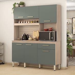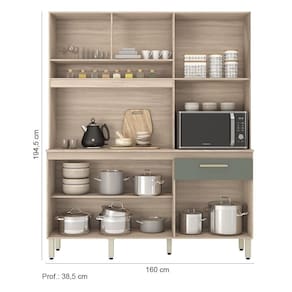 Características Estrutura em MDP. Pintura em acabamento UV. 06 Portas articuladas com dobradiças metálicas 01 Gaveta com corrediças metálicas Espaço para forno ou Micro-ondas Pés e puxadores em plástico ABS Pés com regulagem de altura Prateleiras e compartimentos amplos e bem divididos