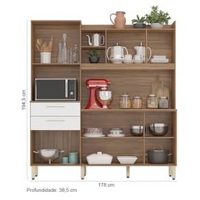Características Estrutura em MDP. Pintura em acabamento UV. 06 Portas articuladas com dobradiças metálicas Pistão a gás 02 Gavetas com corrediças metálicas Espaço dedicado especialmente ao Microondas Pés com regulagem de altura Puxadores em plástico ABS Prateleiras e compartimentos bem divididos