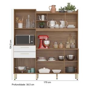 Características Estrutura em MDP. Pintura em acabamento UV. 06 Portas articuladas com dobradiças metálicas Pistão a gás 02 Gavetas com corrediças metálicas Espaço dedicado especialmente ao Microondas Pés com regulagem de altura Puxadores em plástico ABS Prateleiras e compartimentos bem divididos