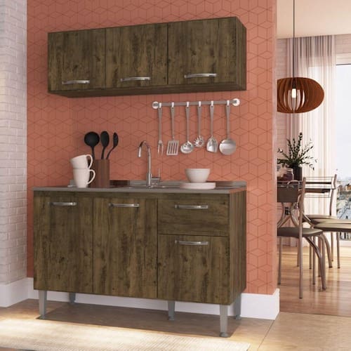 A Cozinha Light é um produto com excelente qualidade, produzido em MDP de fácil montagem, portas fixadas com dobradiças metálicas e gaveta com corrediças metálicas. Facilitando a organização dos seus utensílios em geral, possui também pés com regulagem de altura deixando assim sua casa com um ambiente mais moderno e aconchegante. Altura do Conjunto: 194 cm Ambiente: null Ambiente Principal: Cozinha Cor: Itaúba Informação Complementar: 1x Armário de Cozinha Aéreo 3 Portas Light Móveis ItaúbaLargura: 120 cmAltura: 38 cmPeso: 14 kgProfundidade: 32 cmNecessita Montagem: Sim1x Balcão 3 Portas 1 Gaveta Light ItaúbaLargura: 120 cmAltura: 78 cmPeso: 24 kgProfundidade: 52 cmNecessita Montagem: Sim Possui Portas: 03 Possui Rodízio: Não Tamanho:
