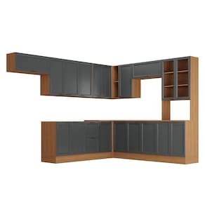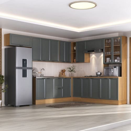 Informações Complementares: Portas de bater almofadadas/molduradas em MDF sendo 02 portas com detalhe em vidro incolor 3mm; balcão 80cm, balcão 41cm e balcão canto com tampo de 27mm de espessura; balcão 120cm sem tampo ideal para pia que atenda a medida de 120x50cm; aéreo canto e ba