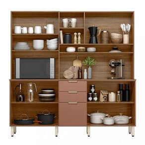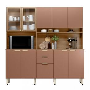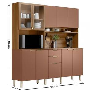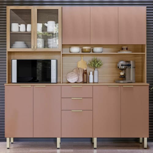 A Cozinha Amora traz sofistica??o e funcionalidade com design em linhas retas. Conta com gavetas, portas de giro com prateleiras e vidro incolor, nicho para temperos ou decora??o, e espa?o para forno ou micro-ondas. A ampla bancada ? ideal para preparo de alimentos e montagem de um cantinho do caf?. P?s regul?veis garantem nivelamento e prote??o contra umidade, proporcionando durabilidade e praticidade.