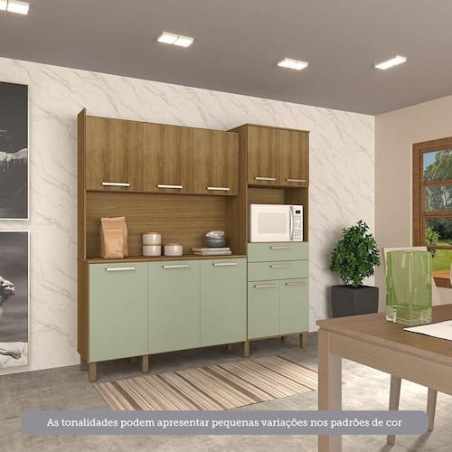 Coz Compacta 200cm 10 Pt E 2 Gv +tampo 355 Luciane Móveis Carvalho/avela/verde Mar Desenvolvida para quem busca qualidade e charme, a Cozinha 355 e perfeita! Estruturas em 100 MDP que oferecem maior resistencia e durabilidade ao movel. Possui estilo classicos, garantindo conforto e aconchego para sua Cozinha. Ideal para espacos menores. Caracteristicas: Estrutura: MDP 12mm e 15mm Acabamento: Caixaria em Pintura UV e Frontais em PF Quantidade de Portas: 10 de abrir/bater Tipo de Dobradicas: Metalica Slow Motion (amortecimento) Quantidade de Gavetas: 2 Tipo de Corredicas: Metalica Telescopica Tipo de Puxador: Alca Gold em Plastico ABS Quantidade de Prateleiras: 3 Quantidade e Tipo de Pes: 8 em Plastico PS com regulagem de altura Suporta ate: Gavetas 5kg, Prateleiras 9kg e Tampo/Base 20kg. Sistema de Montagem: Cavilhas, Parafusos e Minifix Itens Inclusos: 1 Cozinha Compacta com Tampo, Kit Ferragens e Manual de Montagem Garantia: 3 meses