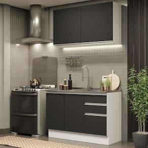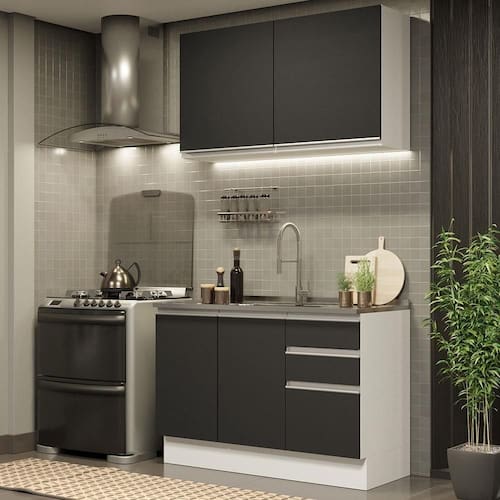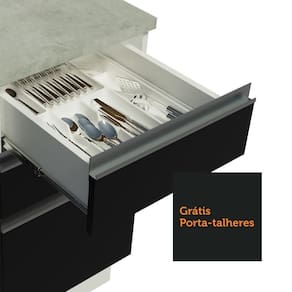 O acabamento da cozinha é Branco, as portas e frentes são em preto, partes internas das gavetas e das costas, são brancas. Feito em Pintura Poliéster ecológica, com aplicação de 7 camadas de proteção resistentes a álcool, água e calor.