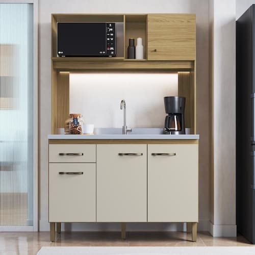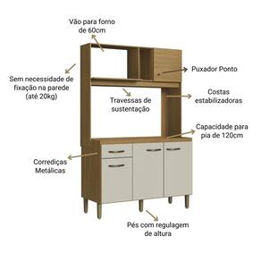 A Cozinha Compacta CO1202 possui 1,90m de altura e 1,22m de largura, com capacidade para pia de 1,20m (não acompanha pia). Sua travessa de sustentação e as costas estabilizadoras, permitem que ela não precise de fixação na parede (até 20kg). Compacta e funcional para o seu dia a dia.