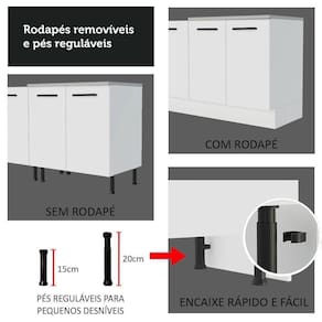 Outro diferencial desta cozinha são os pés reguláveis em PVC e os rodapés removíveis em MDP, que facilitam a limpeza. O balcão acompanha tampo em MDP com pintura Mood, que pode ser removido para instalação de pias de inox ou pedra, no espaço de 150 x 52 cm.