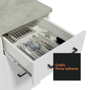 O acabamento da cozinha é branco, feito em Pintura Poliéster com 7 camadas que protegem o móvel dos efeitos do álcool da água e do calor.
